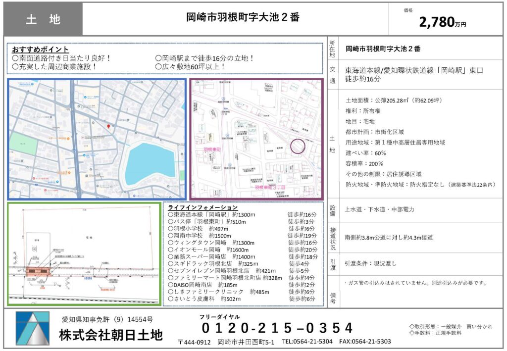 【新着】岡崎市羽根町字大池 土地 2,780万円!建築条件なし・駅徒歩圏内 2025.10.21 南面道路、岡崎駅まで徒歩16分、周辺書商業施設の充実した岡崎市羽根町の土地の売却のご依頼をいただきました。 JR岡崎駅周辺で土地をお探しの方は、ぜひチェックしてください! « NEWSの一覧へ